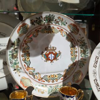 Prato decorativo em porcelana, inspirado na temática histórica da Companhia das Índias e na ligação entre Portugal e o Oriente. Peça dedicada a Rei D. João V, com brasão central e decoração rica em motivos florais e elementos orientais, com detalhes dourados aplicados. No verso apresenta inscrição: “Companhia das Índias – Portugal e o Oriente – Rei D. João V” Edição Limitada 1990 Assinatura decorativa e marca de fabrico presentes. 🔹 Diâmetro: 24 cm 🔹 Peso: 595 g 🔹 Edição limitada (1990) 🔹 Decoração policromada com apontamentos dourados 🔹 Peça decorativa (não indicada para uso alimentar) 🔹 Excelente elemento para coleção