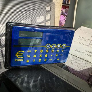 Design azul com grafismo amarelo e símbolo “€ EURO”, provavelmente promocional da fase de introdução da moeda Euro. 📏 Dimensões: 5 cm (altura) x 8 cm (comprimento) ⚖️ Peso: 16 g 🔋 Funcionamento: a pilha botão (não incluída) ✅ Testada e a funcionar Características: • Formato slim tipo cartão • Visor duplo LCD • Funções básicas (+, –, ×, ÷, %) • Leve e portátil • Compartimento traseiro para pilha • Inclui bolsa plástica protetora 📌 Estado: Bom estado geral. Sem pilha incluída. Pequenos sinais normais de uso compatíveis com a idade. Peça interessante para: ✔ Colecionadores de artigos ligados ao Euro ✔ Nostalgia anos 90 / 2000