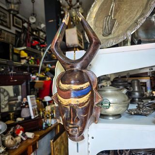 Máscara decorativa africana em madeira maciça, esculpida manualmente, com elementos estilizados e chifres elevados que lhe conferem forte presença visual. Peça inspirada na arte tradicional da África Ocidental (estilo Baule / Senufo), com pintura artesanal em tons naturais. Ideal para: ✔ Decoração étnica ✔ Espaços boho ✔ Escritórios ✔ Salas com identidade ✔ Colecionadores de arte tribal 📏 Altura: 35 cm 📏 Largura: 15 cm 📏 Profundidade: 9 cm ⚖ Peso: 350 g Possui orifícios e cordão traseiro para fixação em parede. 📌 Estado: Bom estado geral. Com marcas naturais da madeira e desgaste estético intencional. Peça decorativa.