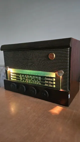 Rádio vintage da General Electric em madeira. - Design clássico. - Botões de controlo. - Mostrador iluminado com escalas para Standard e Short Wave. - Amplificador a válvulas Trabalha mas não consigo sintonizar, apenas ouço ruído.