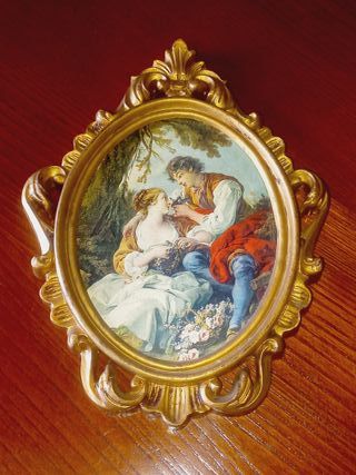 Este encantador quadro vintage apresenta uma cena romântica. Cerca de 20cm x15cm Moldura em madeira dourada. Imagem em tecido envernizado. Sem vidro. Com suporte para colocar na parede. Está em ótimo estado. - Moldura dourada ornamentada. - Formato oval.