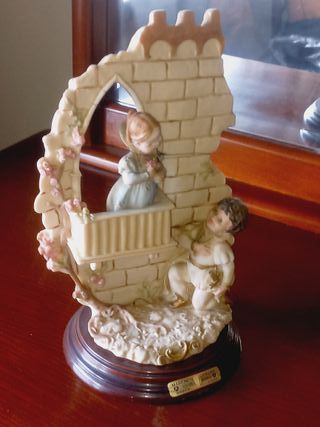 Escultura Vintage Capodimonte N Florence Di Bruno Merli - Romeu e Julieta Em marfinite. Peso: 1,300 kg Altura: 26 cm Base diametro: 14 cm Em excelente estado. - Representa una escena romántica con dos figuras. - Detalle de castillo y rosas. - Base de madera. - Marca: Marfinite Genuine Branca Registrada.