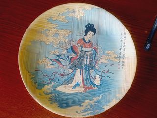 Prato decorativo de bambu. Feito de cana de bambu natural. Apresenta decorações pintadas à mão. A peça retrata uma figura feminina em trajes tradicionais, possivelmente uma divindade ou personagem de lendas japonesas, sobre as ondas. A peça tem inscrições em carateres japoneses no lado direito da imagem. Prato em excelente estado. Diametro: 15 cm Inclui apoio para exposição na vertical.