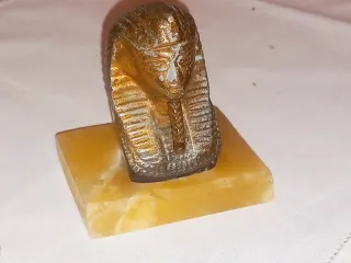 Réplica em miniatura em bronze da máscara mortuária de Tutancâmon montada sobre uma base de Mármore. Comprimento: 9cm Largura: 6cm Altura: 9cm Artigos dos anos 80. Em excelente estado.
