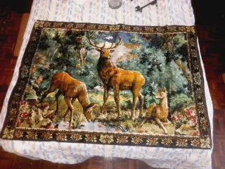 Tapete decorativo em veludo com um cenário florestal e veados. Peça vintage. Tapete decorativo, de chão ou de parede. Em veludo. Artigo Vintage, anos 60/70 128 x 89 cm Em excelente estado. Adquirido em França.
