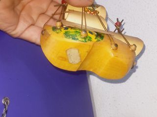 Miniatura de navio feita a partir de um tamanco de madeira, que é um calçado tradicional dos Países Baixos. O objeto é um tipo de artesanato que combina dois símbolos culturais dos Países Baixos: o tamanco de madeira e um navio à vela. A miniatura possui mastros, velas e cordames, com a bandeira dos Países Baixos no topo. A parte do tamanco é decorada com imagens de moinhos de vento, que também são um ícone do país. Com cerca de 14 x 12 cm