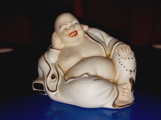 "Buda que ri" ou "Buda gordo". Esta figura não é o Buda histórico, Siddhartha Gautama, mas sim um monge folclórico chinês que se acredita ser uma encarnação do futuro Buda Maitreya. A figura sorridente e com uma barriga proeminente simboliza felicidade, prosperidade, abundância, boa sorte e alegria. Na cultura chinesa, Budai representa contentamento e abundância. Diferente do Buda histórico, Budai era um monge errante, contente apesar de pobre, que carregava os seus poucos pertences num saco. Artigo em cerâmica com cera de 7cm de altura.