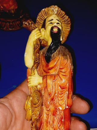 Figuras culturais asiáticas Estatuetas representando figuras culturais asiáticas. A figura à esquerda segura um objeto que se assemelha a um prato ou bacia, enquanto a figura à direita segura um cajado e tem uma barba proeminente. Essas estátuas são associadas a figuras de sorte, sabedoria ou prosperidade. Em cerâmica, com cerca de 22cm e altura cada. Adquiridas em 2000´s