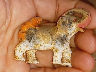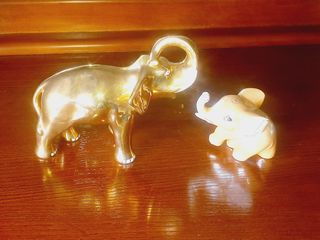 As fotos não estão grande coisa mas os artigos estão impecáveis. O elefante grande tem 15x13cm e o pequeno 10 x 7cm. Em cerâmica dourada. Dizem que atraem a boa sorte para casa! Não sei...