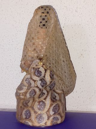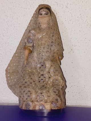 Boneca provavelmente de origem indiana, vestindo um traje tradicional completo com um véu ou dupatta. O traje sugere inspiração na vibrante e luxuosa cultura e herança indiana, possivelmente retratando uma noiva. A boneca usa um vestido e um véu com detalhes brilhantes e metálicos, que lembram um sari ou um conjunto de noiva tradicional indiano. Tem um bindi (pingente na testa) e maquiagem com detalhes dourados, que são comuns em trajes indianos festivos. Boneca adquirida como souvenir. Feita à mão. Com membros articulados. Dimensões: 19cm de altura.