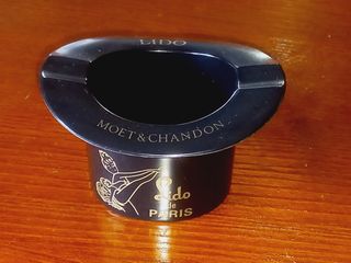 O cinzeiro tem o formato de uma cartola preta e é feito de baquelite rígida com cerca de 10 x 8cm e 5cm de diametro. Apresenta as inscrições "LIDO", "MOET & CHANDON" e "Lido de PARIS". A peça é um item de coleção e foi produzida para fins promocionais na década de 90. O Lido de Paris, conhecido por seus shows de cabaré e burlesco, encerrou suas atividades em 2022. Peça em excelente estado. Nunca usado.