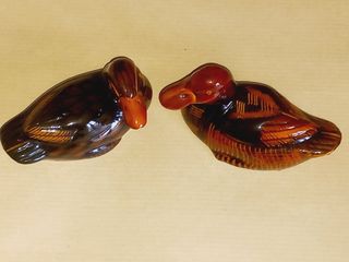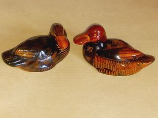 Um charmoso conjunto de dois patos decorativos. - Peças em porcelana com acabamento brilhante. - Detalhes em tons de castanho e laranja. - Design clássico e elegante. Em cerâmica vidrada, pintado à mão. Cerca de 9cm de comprimento. Artigo dos anos 90.