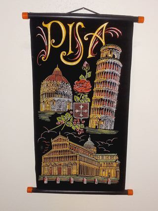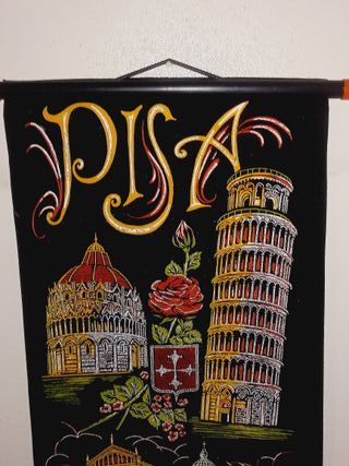 Tapeçaria decorativa com monumentos da cidade de Pisa, na Itália. A tapeçaria tem um fundo preto e ilustrações coloridas, incluindo: A Torre de Pisa, o campanário inclinado da cidade. O Batistério de São João. A Catedral de Pisa, também conhecida como Duomo di Pisa. O brasão de armas da cidade de Pisa, com uma cruz. Adquirida nos anos 90. Está impecável, nunca esteve exposta. 55 x 32cm