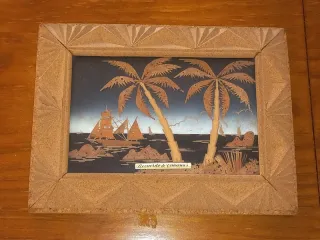 Paisagem feita em cortiça recortada e montada em relevo. 24 x 18 cm.