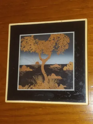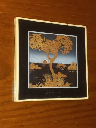 Paisagem feita em cortiça recortada e montada em relevo. 13 x 13 cm.