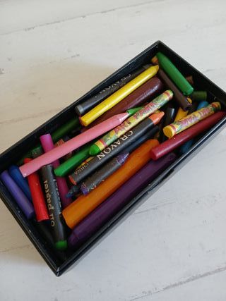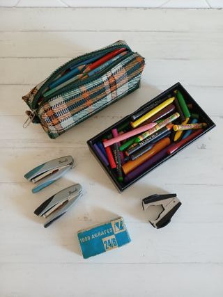 Conjunto de vários lápis de cores, lápis de cera e óleo, dois agrafadores, um tira agrafos e uma caixa de 1000 agrafos. Preço pelo conjunto.