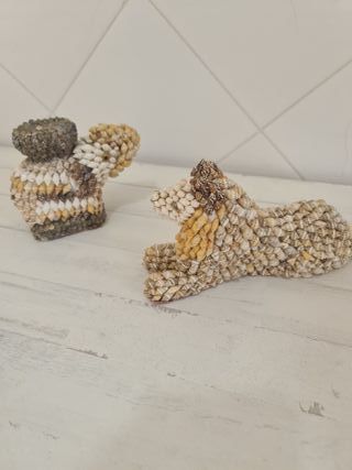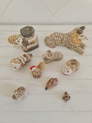 Conjunto de peças artesanais feitas com conchas, formando animais. - Peças únicas. - Detalhes em conchas variadas. - Ideal para decoração. Em excelente estado, preço pelo conjunto.