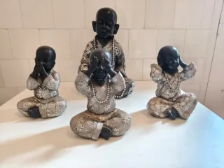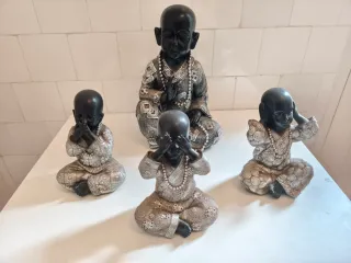 Vendo conjunto de 4 figuras decorativas de cerámica estilo zen/oriental: ✅ 3 figuras pequeñas representando: No ver 🙈 No oír 🙉 No hablar 🙊 ✅ 1 figura grande en postura de meditación (muy decorativa) 📏 Medidas: Figura grande: 38 cm de alto Figuras pequeñas: 23 cm de alto 🎨 Colores: negro y plata (acabado elegante tipo metálico / envejecido) 🏡 Ideal para: salón, entrada, estantería, spa, yoga, decoración zen, feng shui 🧼 Estado: muy bueno, sin roturas (ver fotos). 📍 Entrega en mano o por envío separado para evitar roturas al ser muy fragil (cerámica). Se puede ver sin compromiso en Tavira o provincia de Huelva.