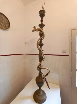 Vendo shisha / narguile árabe antigua XXL, una pieza espectacular traída de Arabia Saudita hace más de 50 años. 📏 Altura: 1,57 m (gigante, muy decorativa) ✅ Material: metal grabado con detalles perforados ✅ Incluye: estructura completa + manguera tradicional + cazoleta ✅ Estado: perfecto, muy bien conservada (ver fotos) Ideal para coleccionistas o para decoración en salón, bar, restaurante, hotel, tienda temática, escaparatismo o ambiente árabe/oriental. 📍 Por tamaño y delicadeza: solo entrega en mano en Tavira o Huelva provincia.
