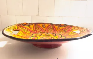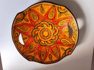 Vendo cerámica artística decorativa de 43 cm de diámetro, con grabado y pintura a mano en tonos cálidos (rojos, naranjas y ocres), con diseño floral central y motivos geométricos. ✅ Pieza grande y muy vistosa ✅ Ideal como centro de mesa, bandeja decorativa, decoración de salón o recibidor ✅ Tiene dos asas laterales integradas ✅ En muy buen estado (ver fotos) 📏 Medida: 43 cm de diámetro 📍 Entrega en mano o envío bien protegido.