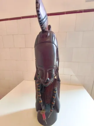 Vendo escultura/figura étnica tallada en madera, pieza decorativa grande y muy vistosa, ideal para salón, entrada, estudio o decoración tipo boho/tribal/étnica. Tiene detalles trabajados y colgante ornamental, quedando espectacular como elemento decorativo. 📏 Medidas: 58 × 16 cm 🪵 Material: madera ✨ Estado: muy bueno (se aprecia el uso normal en una pieza artesanal)
