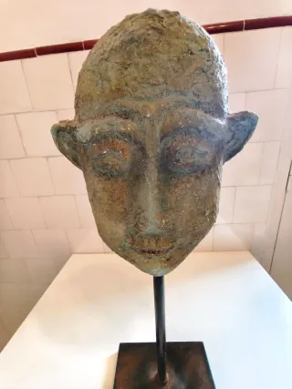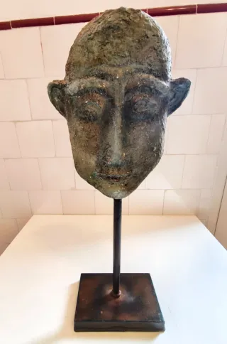 Vendo máscara decorativa étnica/artesanal montada sobre soporte metálico con base, ideal como pieza de decoración para salón, entrada, estudio o local. Tiene un acabado envejecido/pátina muy atractiva, estilo tribal, y queda espectacular como elemento decorativo. 📏 Medidas: 50 × 24 cm 🪵 Material: madera y metal ✨ Estado: bueno (con pátina y marcas propias del estilo artesanal)