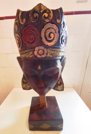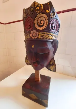 Vendo máscara decorativa artesanal en madera, de gran tamaño, con detalles tallados y pintados en tonos burdeos, dorado y motivos florales. Incluye peana/base, por lo que queda perfecta para colocar en salón, entrada, estudio, despacho o local como pieza principal de decoración. 📏 Medidas: 62 × 27 cm 🪵 Material: madera ✨ Estado: muy bueno, acabado artesanal