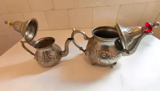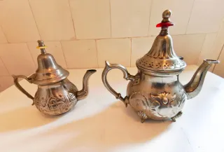 Vendo lote de 2 jarras/teteras decorativas de metal estilo árabe/marroquí, con detalles grabados en relieve y tapa. Muy bonitas para decoración vintage, salón, cocina, estantería o ambiente marroquí. 📌 Incluye 2 piezas: Jarra grande: 20 cm alto x 23 cm ancho Jarra pequeña: 17 cm alto x 18 cm ancho ✅ Metal trabajado / repujado ✅ Con tapa ✅ Ideales para decoración o coleccionismo 📍 Estado: usado, con señales normales del tiempo (ver fotos)