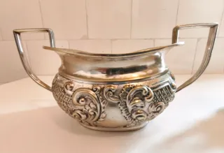 Vendo lote de 2 salseras / soperas pequeñas de metal plateado (tipo alpaca o metal decorativo), con dos asas y decoración en relieve estilo clásico/vintage. Perfectas para decoración, mesa elegante, coleccionismo o uso como salsera para salsas/cremas (según preferencia). 📌 Medidas: Grande: 8 cm alto x 21 cm ancho (de asa a asa) Pequeña: 7 cm alto x 15 cm ancho (de asa a asa) ✅ Bonito trabajo en relieve ✅ Estilo antiguo/vintage