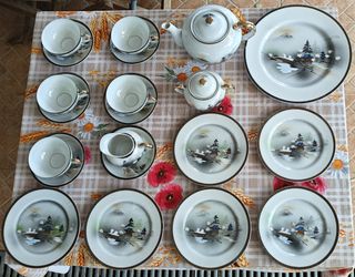 Ritz China - Hand Painted Conjunto inclui: - 1 prato grande (27cm de diâmetro); - 6 pratos médios (18,5cm de diâmetro); - 6 pratos pequenos (13,5cm de diâmetro); - 5 chávenas de chá; - 1 recipiente para leite; - 1 açucareiro; - 1 bule de chá. Tudo em ótimo estado, sem lascas ou estaladelas. Preferência por entrega em mão. Valor negociável. Mais informações por mensagem privada.