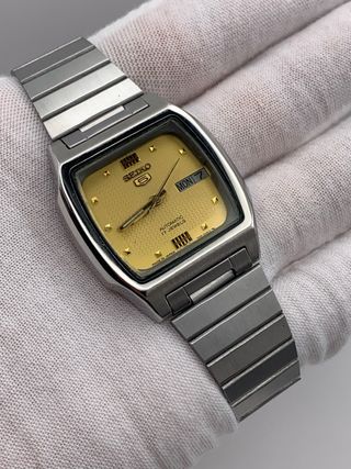 Relógio Seiko 5 vintage com mostrador dourado. - Caixa e bracelete em aço inoxidável. - Movimento automático. - Exibe dia e data. - Ponteiros e marcadores de hora dourados.