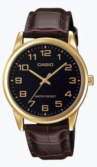 Relógio Casio clássico com pulseira em couro marrom e caixa dourada. - Design elegante e atemporal. - Movimento a quartzo. - Resistente à água.
