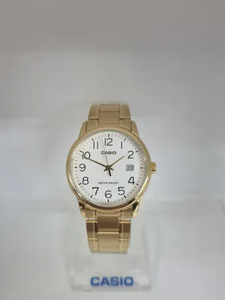Relógio Casio original, com um design elegante e dourado. Perfeito para o dia a dia. - Caixa e bracelete em aço inoxidável dourado. - Mostrador branco com números arábicos. - Calendário. - Resistente à água.