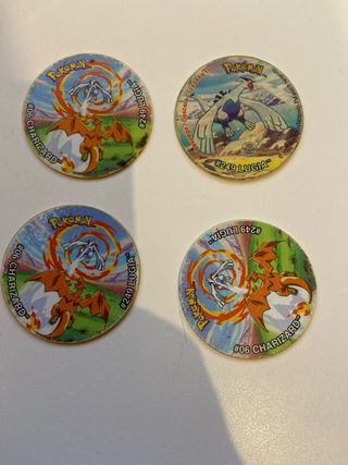 Conjunto de 4 tazos Pokémon. - 3 Tazos Charizard vs Lugia - 1 Tazo Lugia (com sticker)