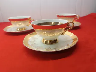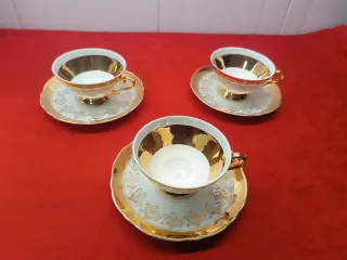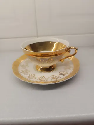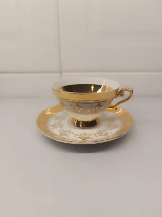 Conjunto de seis chávenas de café em porcelana antiga da Vista Alegre. O interior das chávenas é em dourado brilhante, com detalhes florais em relevo na base e no pires. - Conjunto de 6 chávenas e 6 pires. - Porcelana branca com acabamento dourado. - Design clássico e elegante. Em muito bom estado. Vendo o conjunto a 90 euros, a unidade a 17 euros. Entrego em mãos em Vila Nova de Gaia, Porto, Gondomar, Matosinhos, Maia, Ermesinde, Valongo, Paredes, Penafiel, Paços Ferreira, Lousada, Argoncilhe, Espinho, Santa Maria da Feira, São João da Madeira, Ovar, Estarreja. Também envio por transportadora