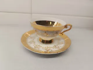 Conjunto de chávena e pires em porcelana com detalhes dourados. - Design clássico e elegante. - Acabamento em ouro. - Peça de colecionador. Da prestigiada marca Vista Alegre. Em excelente estado. Entrego em mãos em Vila Nova de Gaia, Porto, Gondomar, Matosinhos, Maia, Ermesinde, Valongo, Paredes, Penafiel, Paços Ferreira, Lousada, Argoncilhe, Espinho, Santa Maria da Feira, São João da Madeira, Ovar, Estarreja. Também envio por transportadora