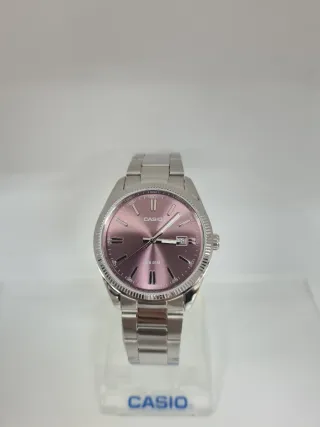 Relógio Casio original com mostrador em tom rosado e pulseira em aço. - Detalhe de calendário. - Resistência à água WR 50M.