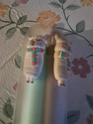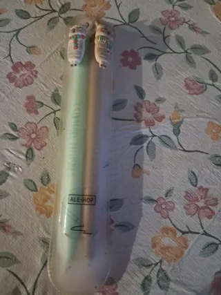 Conjunto de duas canetas de gel com decorações fofas no topo. Perfeitas para dar um toque especial ao seu material de escrita. - Duas canetas incluídas. - Decorações em formato de bichinhos com cachecóis coloridos. - Corpo translúcido com detalhes em verde e bege.