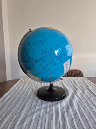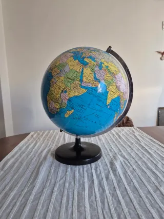 Globo terrestre em suporte, com cartografia detalhada e cores vivas. Nomes de países e cidades bem legíveis. Decoração ou apoio escolar. Base: Plástico rígido preto, estável e com rotação suave.