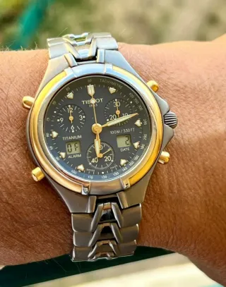 Totalmente funcional, muito bom estado, vintage, todo completo com caixa, livro de instruções, documento de compra, elos extras. O Tissot T671 é um relógio cronógrafo de quartzo com caixa e bracelete em titânio, produzido principalmente entre o final da década de 1990 e o início dos anos 2000. Este modelo destaca-se pela sua construção leve e pelas múltiplas funções digitais e analógicas integradas. Especificações Técnicas Movimento: Quartzo suíço de 23 rubis (Calibre ETA 251.265). Material: Caixa e bracelete em titânio. Cristal: Vidro de safira resistente a riscos. Mostrador: azul, apresentando marcadores luminosos.