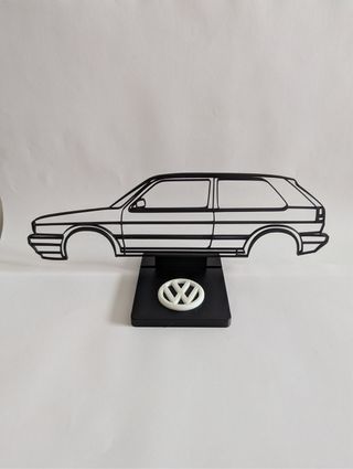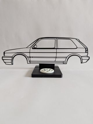 Silhueta do icónico Golf mk2, ideal para colecionadores ou entusiastas de carros. - Design minimalista em preto. - Base preta com emblema VW branco.