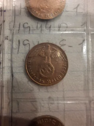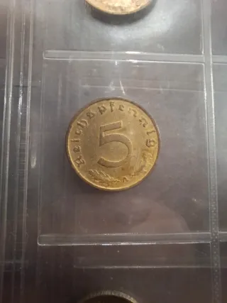 Preço de cada moeda. Moedas da Alemanha, 5 Pfennig, período do Terceiro Reich (1933–1945), nazi. País: Alemanha Ano: 1937 A Ano: 1938 A, D, F Ano: 1939 A, B, D, F Material: Bronze Originais, não são réplicas. Moedas com circulação, mas com detalhes visíveis, incluindo a águia imperial e inscrição original. 📸 Envio fotos das moedas que vão comprar para mostrar o estado real da moeda. 📦 Possível entrega em mão a combinar em Viseu ou Nelas. Se estiveres interessado em mais moedas do mesmo período, tenho outras datas e denominações disponíveis — posso fazer lote.