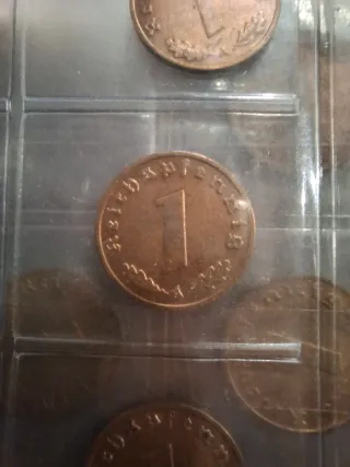 Preço de cada moeda. Moedas da Alemanha, 1 Pfennig, período do Terceiro Reich (1933–1945), nazi. País: Alemanha Ano: 1937 A, D, E, F, J Ano: 1938 A, D, E, F, G Ano: 1939 A, D, E, F, G Material: Bronze Originais, não são réplicas. Moedas com circulação, mas com detalhes visíveis, incluindo a águia imperial e inscrição original. 📸 Envio fotos das moedas que vão comprar para mostrar o estado real da moeda. 📦 Possível entrega em mão a combinar em Viseu ou Nelas. Se estiveres interessado em mais moedas do mesmo período, tenho outras datas e denominações disponíveis — posso fazer lote.