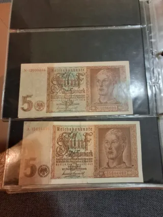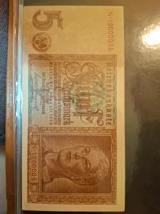 Vendo nota original de 5 Reichsmark, emitida na Alemanha (Deutsches Reich, nazi) em 1942, período da II Guerra Mundial. Nota autêntica da época, com detalhes e simbologia históricos bem preservados. Peça com forte interesse histórico e colecionável, ideal para numismatas, colecionadores de material do III Reich. 📍 Entrega em mãos possível em Viseu ou Nelas 📦 Envio por correio disponível – portes a cargo do comprador Tenho também outras notas, moedas e selos deste período histórico. Se houver interesse em mais material ou em conjuntos, é só perguntar.