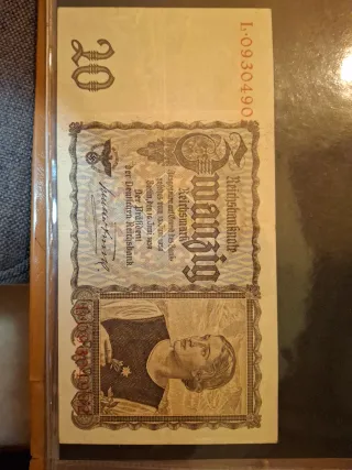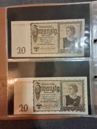 Vendo nota original de 20 Reichsmark, emitida na Alemanha (Deutsches Reich, nazi) em 1939, período da II Guerra Mundial. Nota autêntica da época, com detalhes e simbologia históricos bem preservados. Peça com forte interesse histórico e colecionável, ideal para numismatas, colecionadores de material do III Reich. 📍 Entrega em mãos possível em Viseu ou Nelas 📦 Envio por correio disponível – portes a cargo do comprador Tenho também outras notas, moedas e selos deste período histórico. Se houver interesse em mais material ou em conjuntos, é só perguntar.