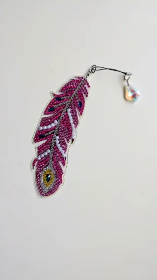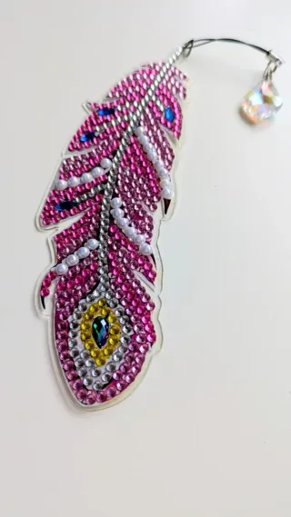 Marcador de livros em forma de pena, decorado com a técnica Diamond Painting. Finalizado com selante, que lhe confere maior brilho, limpeza e durabilidade. Com pingente em forma de gota. Completamente novo!