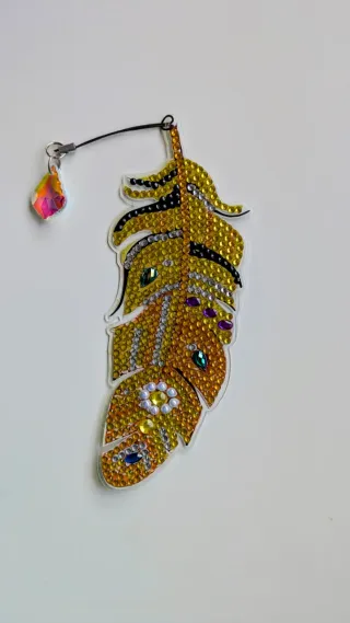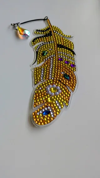 Marcador de livros em forma de pena, decorado com a técnica Diamond Painting. Finalizado com selante, que lhe confere maior brilho, limpeza e durabilidade. Em tons de amarelo e preto. Com pingente em forma de gota. Completamente novo!