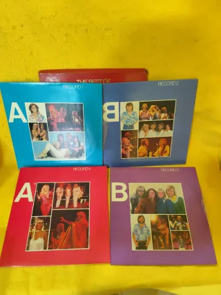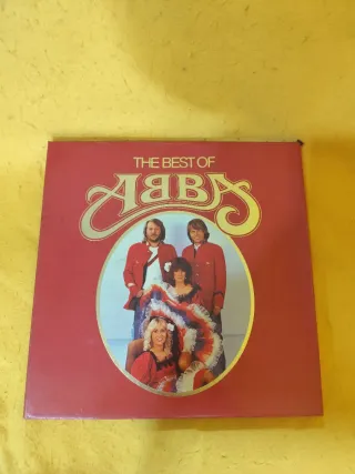Coletânea musical The Best of ABBA. - Capa vermelha com detalhes dourados. - Imagem circular com os membros da banda.
