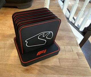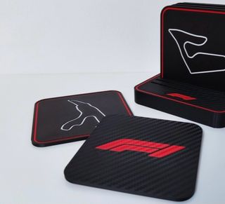 Conjunto de porta copos com design inspirado na Fórmula 1. - Base preta com contorno vermelho. - Detalhe de circuito de corrida em branco. - Logotipo F1 na base.