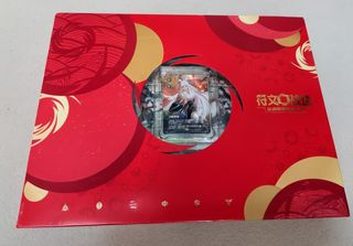 Edição especial do Riftbound Lunar Revel Bundle de 2026. - Embalagem temática vermelha com detalhes dourados. - Inclui uma carta colecionável em destaque.